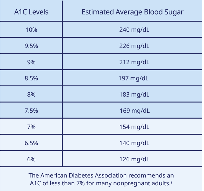 aYour A1C goal may be higher or lower than the ADA recommends. Ask your health care professional for your specific goal.